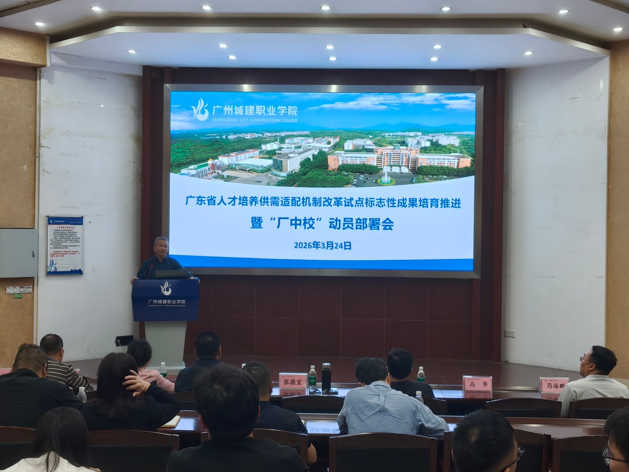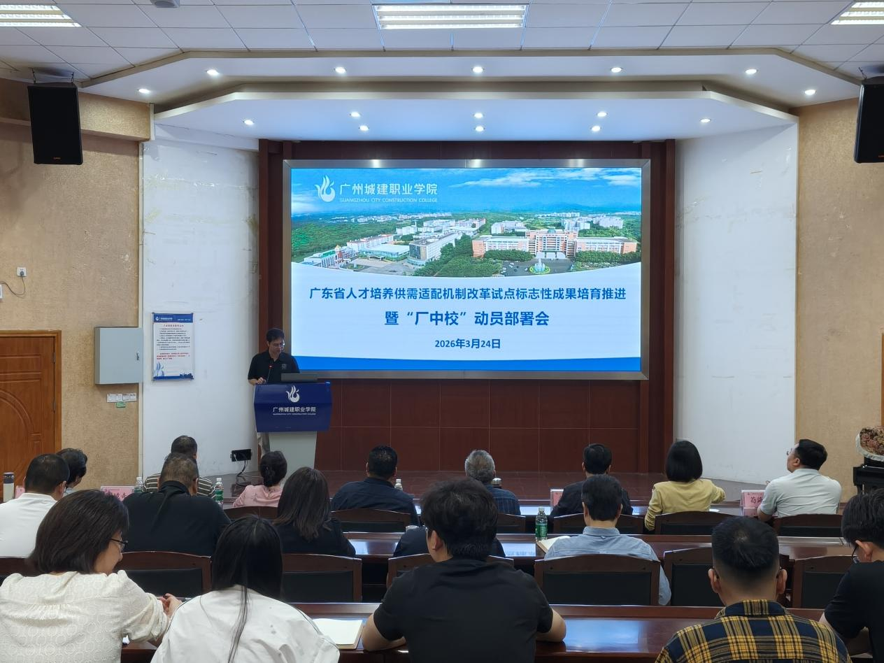 3月24日下午,学校在广州校区建工机电楼A101报告厅召开广东省人才培养供需适配机制改革试点标志性成果培育推进暨“厂中校”订单培养动员部署会。学校副校长、党委副书记张德宜,校长助理张双,相关职能部门、二级学院领导及2024级带班辅导员出席会议。
